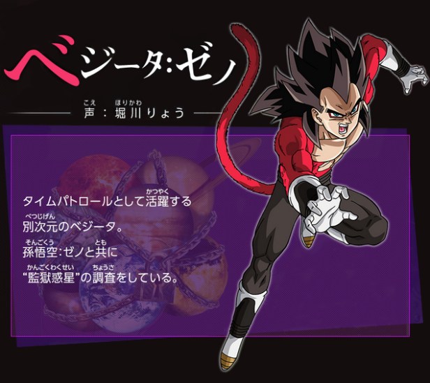 Vegeta Xeno: Este Vegeta pertenece a la realidad Xenoverse. Su máxima transformación es también el super saiyan 4. Trabaja como patrullero para Chronoa.