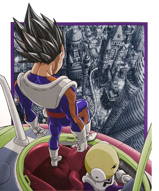 Vegeta va a saltar de la nave que conduce Irico. Lleva puesto el traje de la patrulla galáctica, es el guerrero Z que nos faltaba.