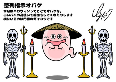 Para Halloween tenemos al pequeño ayudante de Baba la vidente. Este adorable fantasma con gorrito hace de secretario de la bruja. Lo vemos en medio de dos esqueletos guardianes.