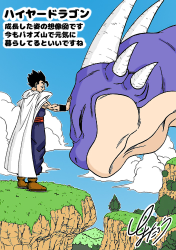 Comenzamos el 2023 con un personaje clásico, High Dragon. Fue un gran amigo de Gohan en su infancia y compañero de las aventuras no canónicas de Dragon Ball. Toyotaro cree que el dragón aún puede vivir en las montañas Paozu, visiblemente más grande por el paso del tiempo. Gohan va a visitarlo, está vestido con el traje de Piccolo, como en la película Super Hero.