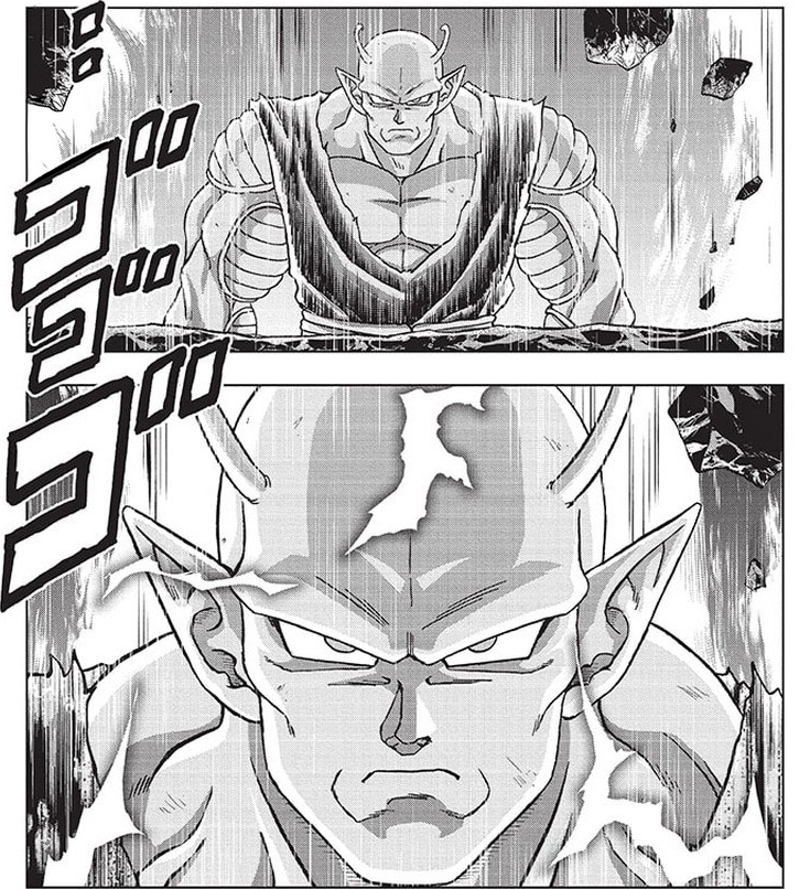 Piccolo decide intervenir también, usará el poder que le ha otorgado Shenron. Sus características rayas de la piel se desvanecen y su tono de piel se pone más amarillento.