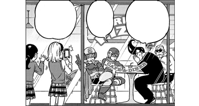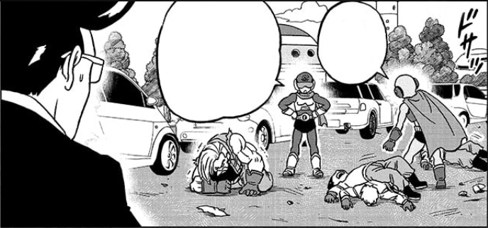 De pronto se tienen que parar, hay un atasco de tráfico. Delante de ellos los héroes Saiyaman X1 y X2 se están enfrentando a unos atracadores de bancos. Goten y Trunks se hacen cargo de la situación con facilidad.