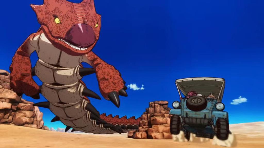 Nada más comenzar el trayecto, encuentra la primera gran amenaza, un ciempiés gigante de las arenas les ataca. Logran escapar pero la pérdida es grande, el monstruo se ha comido el remolque que contenía toda la comida, agua y combustible.