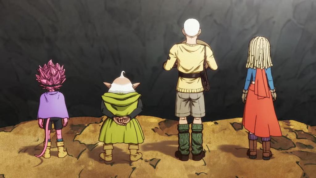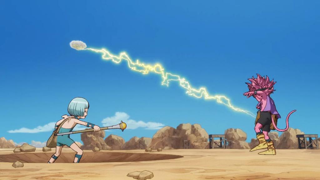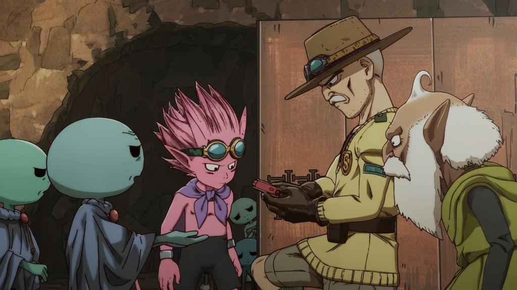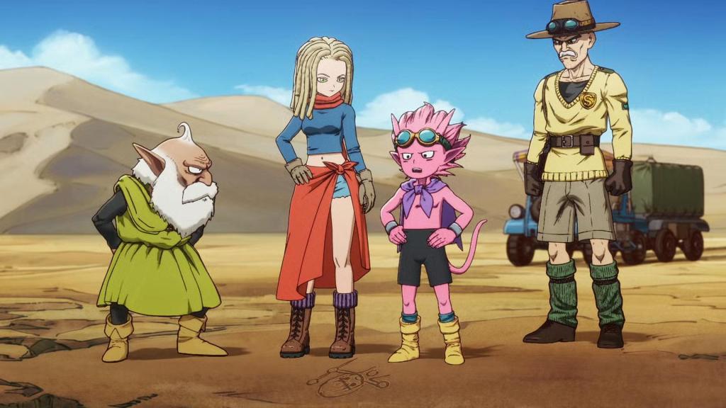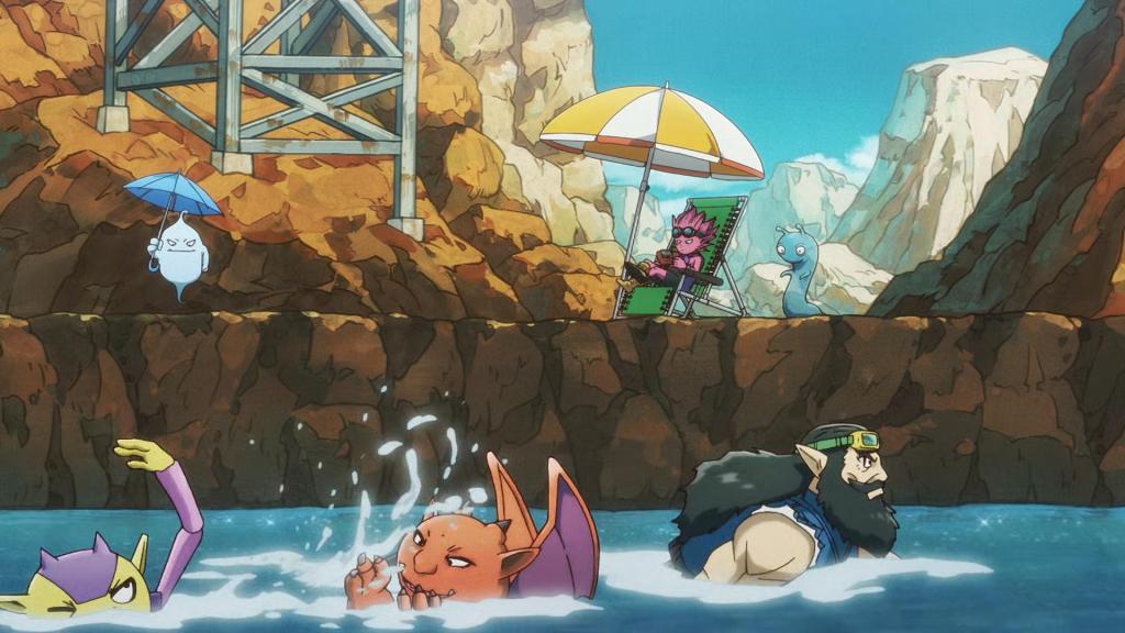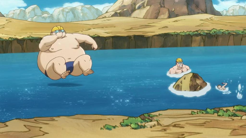 En el camino ven a los Swimmers nadando en el río y Guppy se tira a lo bomba. Todos los habitantes de Sand Land disfrutan del agua, incluso podemos ver que la vegetación está volviendo en los márgenes del río.