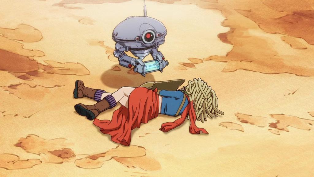 No muy lejos en el desierto, una chica de rastas rubias escapa de unos robots en su moto. Se deshace de algunos de ellos, pero finalmente acaba en el suelo inconsciente. Uno de los robots le roba una muestra de aquanium.