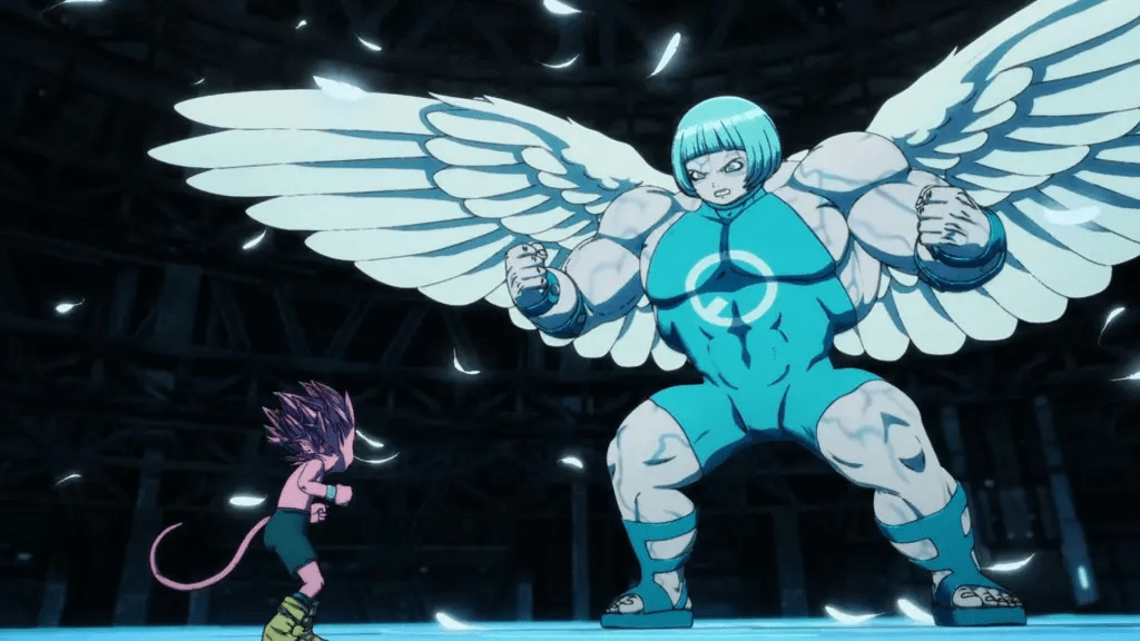 Muniel va a matar a Ann, entonces Beelzebub reacciona, su poder demoníaco a despertado una vez más, un aura roja lo rodea. Rompe el brazo del ángel para que no pueda controlar a nadie como antes y de una patada lo lanza al techo que brilla con el resplador de aquanium.
