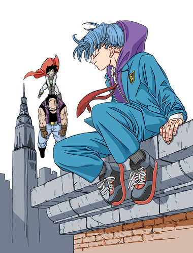 Trunks está sobre un tejado con su ropa de instituto y volando se acerca Goten vestido de Saiyaman X2 sosteniendo a un malhechor. ¡Qué ganas tenemos de que el manga continúe su aventura!