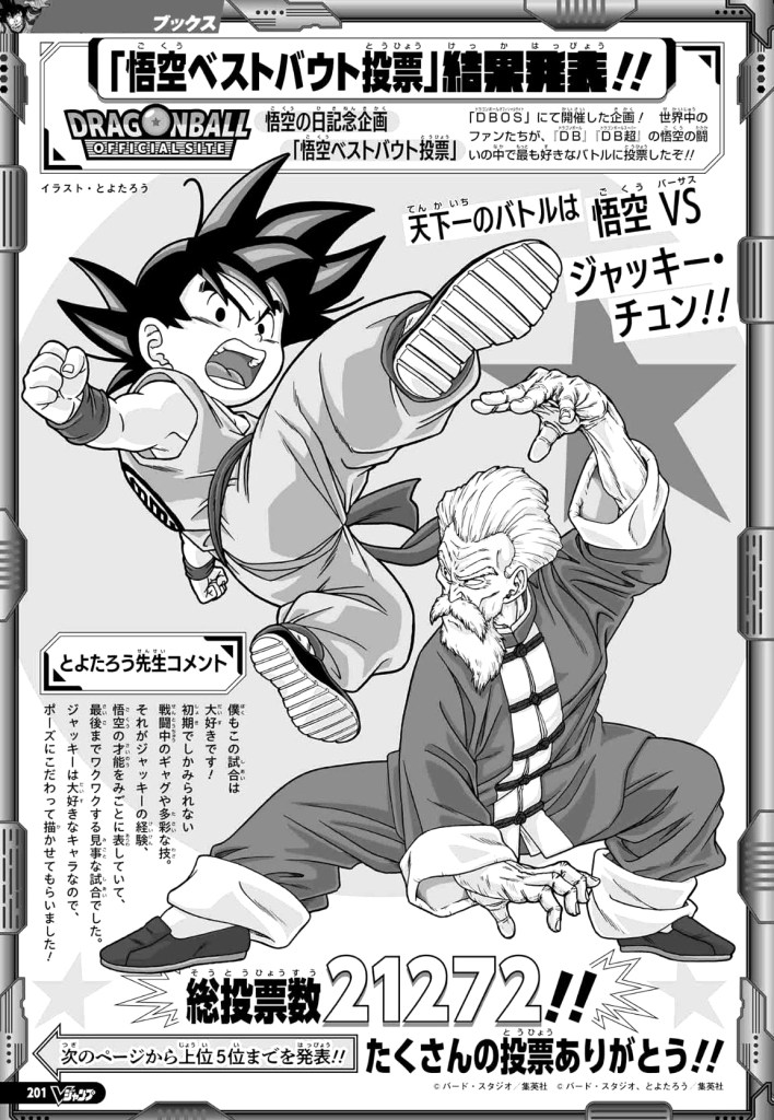 Hace un tiempo se abrió una votación en la web oficial de Dragon Ball para elegir la batalla de Goku preferida por los fans. La ganadora ha sido la gran final del torneo de artes marciales que luchó contra Jackie Chun, que realmente era el maestro tortuga. A Toyotaro también le encanta esta pelea y le han encargado una ilustración para la ocasión.