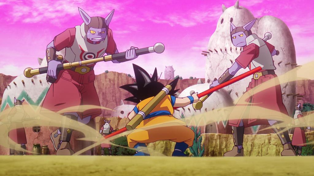 Goku saca su palo mágico y comienza a luchar contra los soldados también. Parece que usando este arma se desenvuelve bien a pesar del aire.