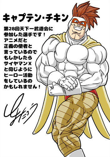 Toyotaro nos va a contar una historia de Trunks como Saiyaman X el mes que viene. Relacionando con el tema de los superhéroes, nos ha dibujado a Captain Chicken, también se supone que es un guerrero de la justicia.
