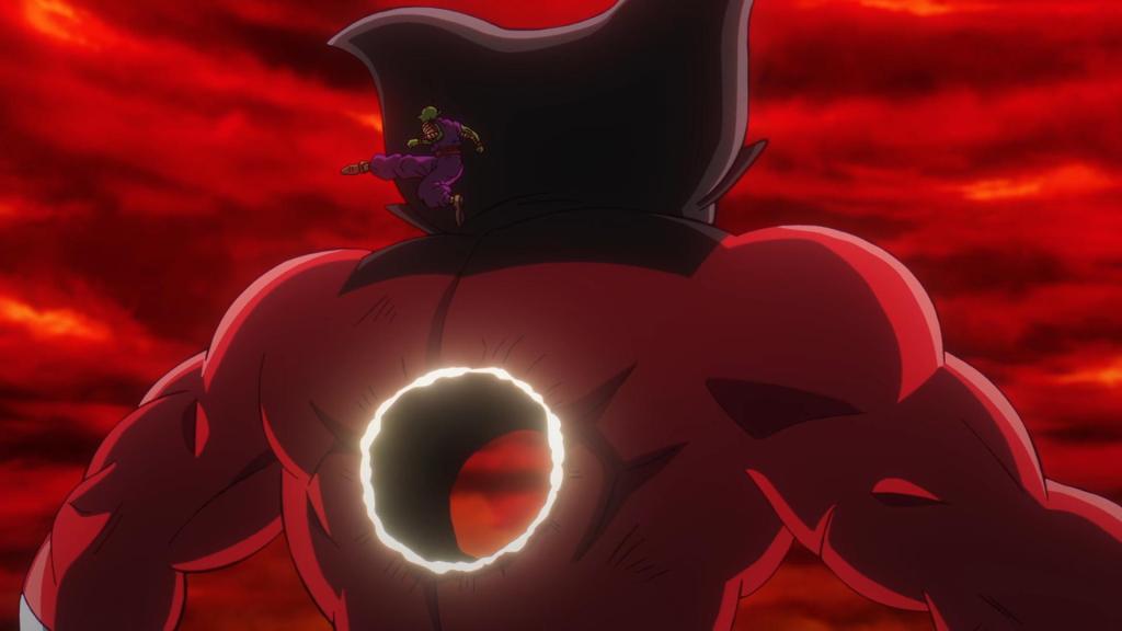 Es el momento, Piccolo se escabulle por detrás para asestar los tres golpes en la nuca que pueden hacer que Gomah pierda el tercer ojo, pero no logra hacerlo.