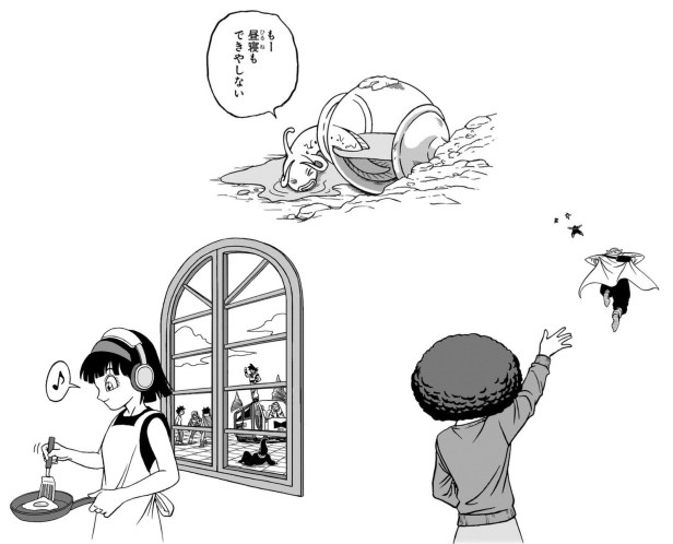 En las imágenes bonus vemos a Videl friendo un huevo escuchando música con unos cascos mientras fuera de su casa están ocurriendo los eventos del capítulo 101. También al pobre pez oráculo tirado probablemente por los entrenamientos de los saiyanos en su planeta. Por último vemos a Janet del capítulo 103, que fue la última corrección que Toriyama realizó.