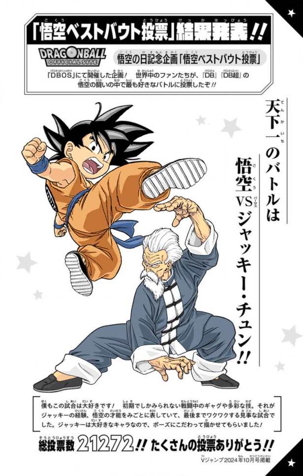 También tenemos la ilustración especial que Toyotaro realizó de la batalla de Goku contra Jackie Chun, fue la más votada por los fans de Dragon Ball.