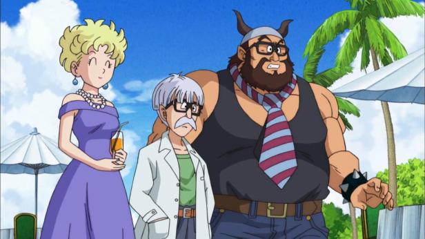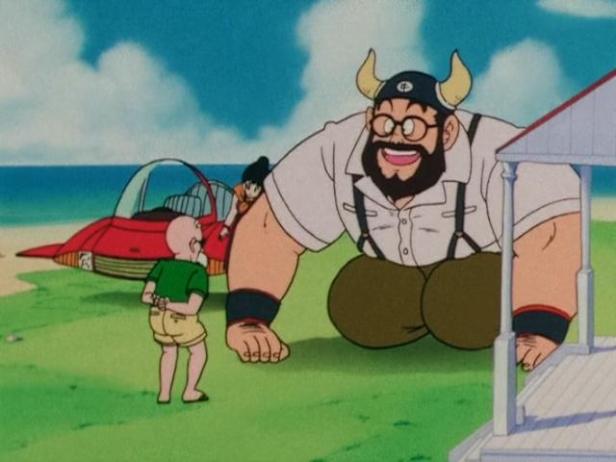 Lo vemos como en el arco de la batalla de los dioses, fue uno de los invitados al cumpleaños de Bulma. Vistió una camiseta de tiras, una corbata, unos vaqueros y unas pulseras de pinchos muy chulas, así lo diseño el propio Toriyama.